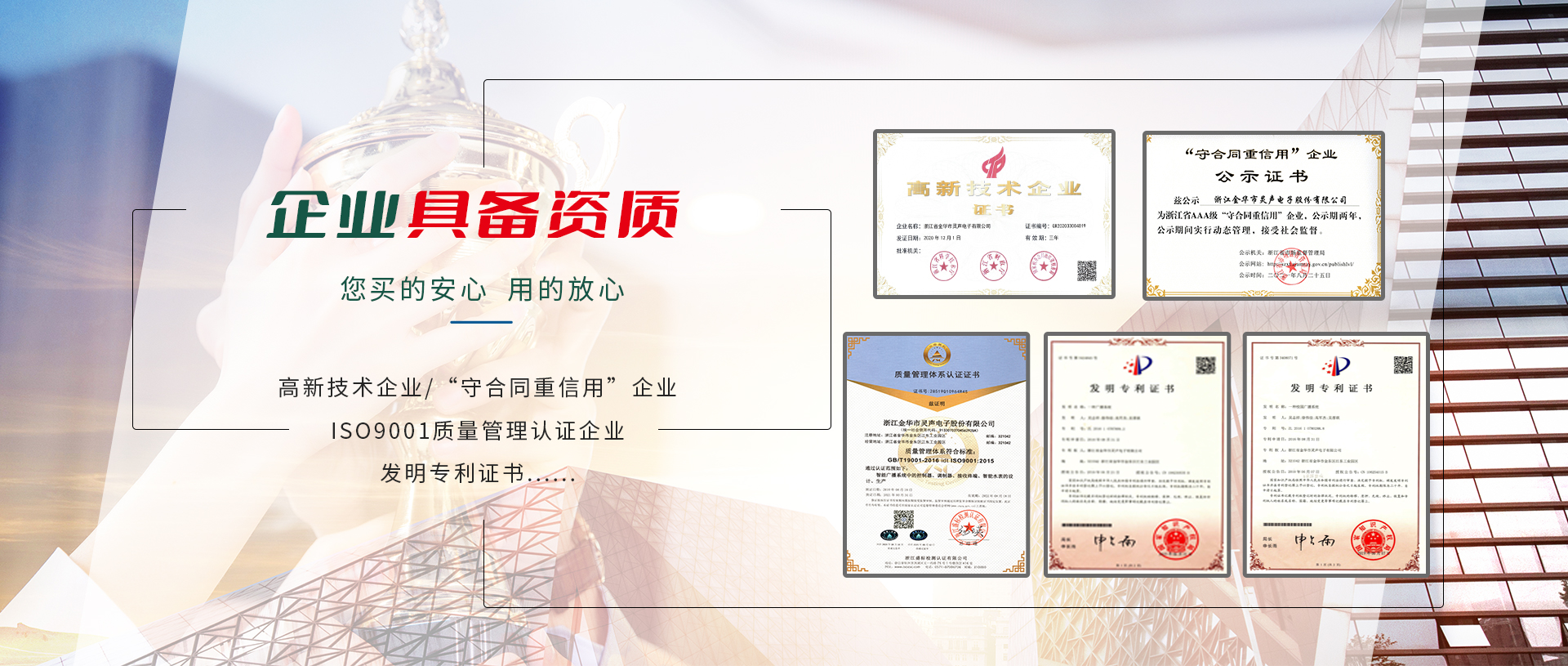 公司2001年通過ISO9001:2008國際質(zhì)量管理體系認(rèn)證、ISO14001:2004環(huán)境管理體系認(rèn)證,相關(guān)產(chǎn)品通過國家CCC認(rèn)證及CQC產(chǎn)品質(zhì)量認(rèn)證,并通過國家廣播電影電視新聞出版總局廣播電視設(shè)備器材入網(wǎng)認(rèn)可。公司注重產(chǎn)品的質(zhì)量與技術(shù)創(chuàng)新,現(xiàn)建有多條先進(jìn)的總裝、檢測(cè)流水生產(chǎn)線及各項(xiàng)檢測(cè)設(shè)備所需的儀器設(shè)備。還擁有全電磁屏蔽室一個(gè),所有高頻產(chǎn)品的調(diào)試均在屏蔽室中進(jìn)行。公司組建了高素質(zhì)的管理隊(duì)伍,設(shè)有研發(fā)部、生產(chǎn)部、銷售部、采購部、質(zhì)檢部、售后服務(wù)中心及財(cái)務(wù)部等部分,并與國內(nèi)多家大專院校、科研單位建立長(zhǎng)期合作關(guān)系,成立了近乎是技術(shù)研發(fā)中心,是金華市職業(yè)技術(shù)學(xué)院重點(diǎn)示范實(shí)習(xí)基地。公司產(chǎn)品先后被浙江、江蘇、重慶、四川、甘肅、山東、湖南、湖北、貴州等文廣新局、電視臺(tái)、氣象局普遍采用,覆蓋全國各省市800多家縣(市)文廣新局、廣播電視臺(tái),并廣泛采用于教育行業(yè),尤其是在近年來的農(nóng)村應(yīng)急廣播“村村響”工程中,靈聲公司中標(biāo)承建的“村村響”工程贏得了各省市廣播電視劇領(lǐng)導(dǎo)、專家們的一致好評(píng)!
